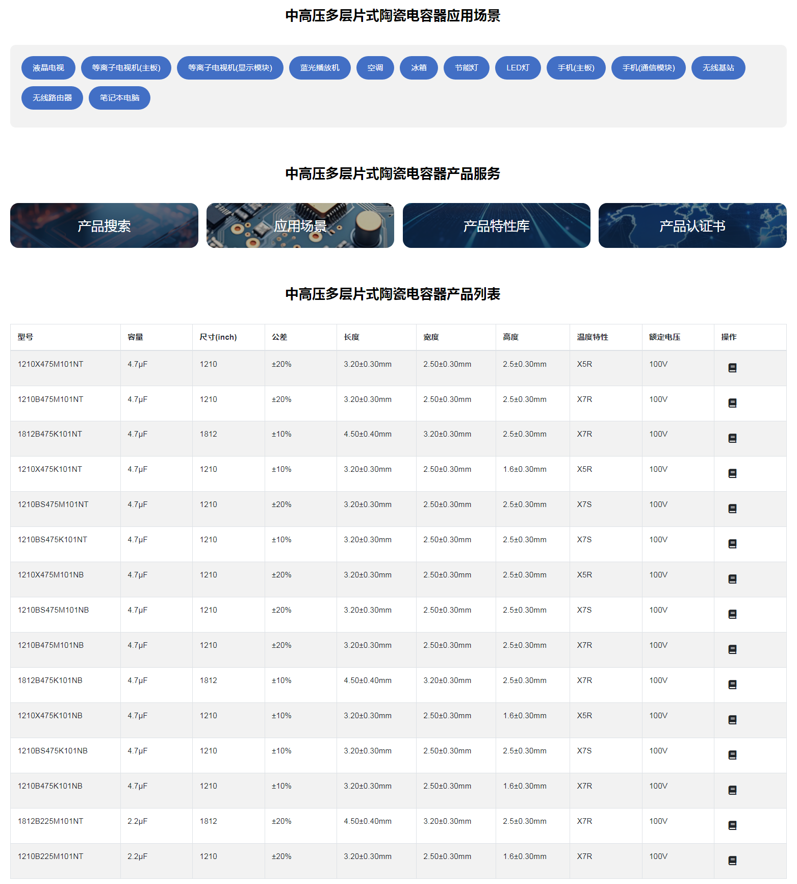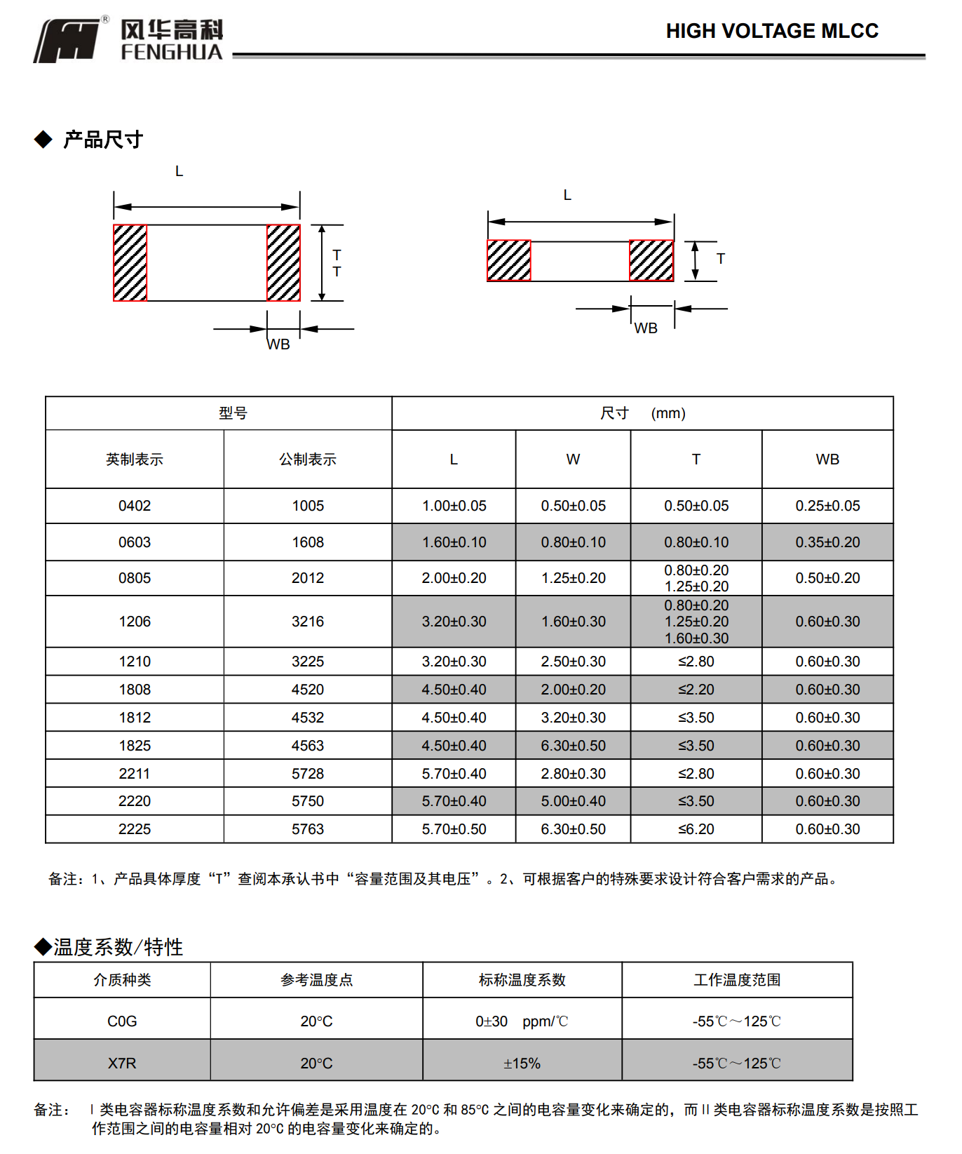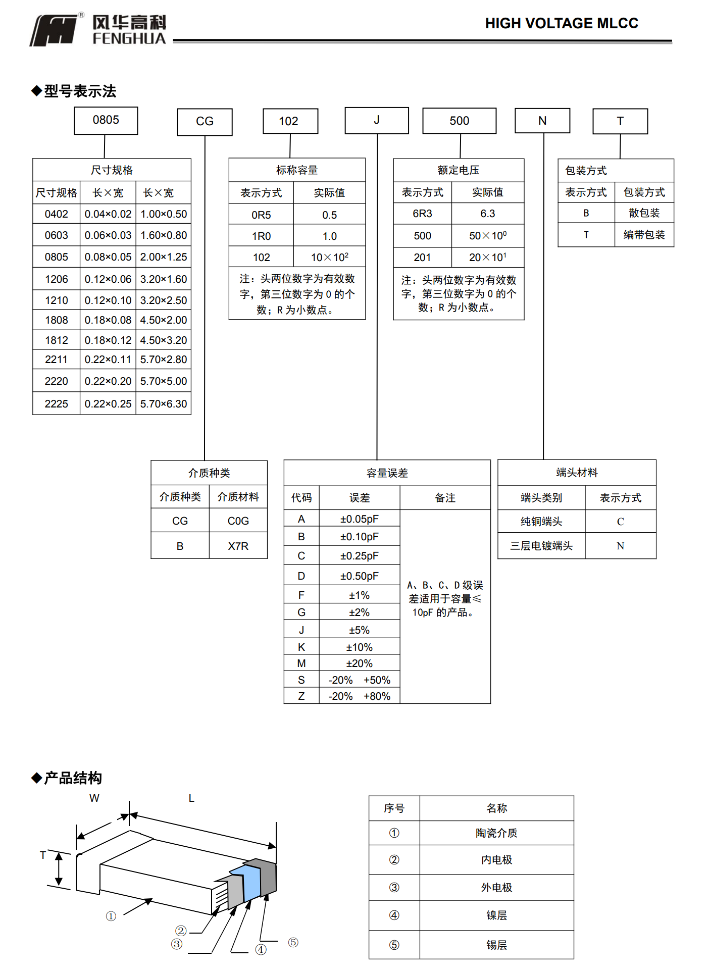 ■中高压系列片式陶瓷电容器◆特征* 中高压多层片状陶瓷电容器是在多层片状陶瓷电容器的工艺技术、设备基础上,通过采用特殊设计制作出来的一种具有良好高压可靠性的产品,该产品适合于表面贴装,适合于多种直流高压线路,可以有效的改善电子线路的性能。* 叠层独石结构,具有高可靠性能* 具有优良的焊接与耐焊性能,适用于