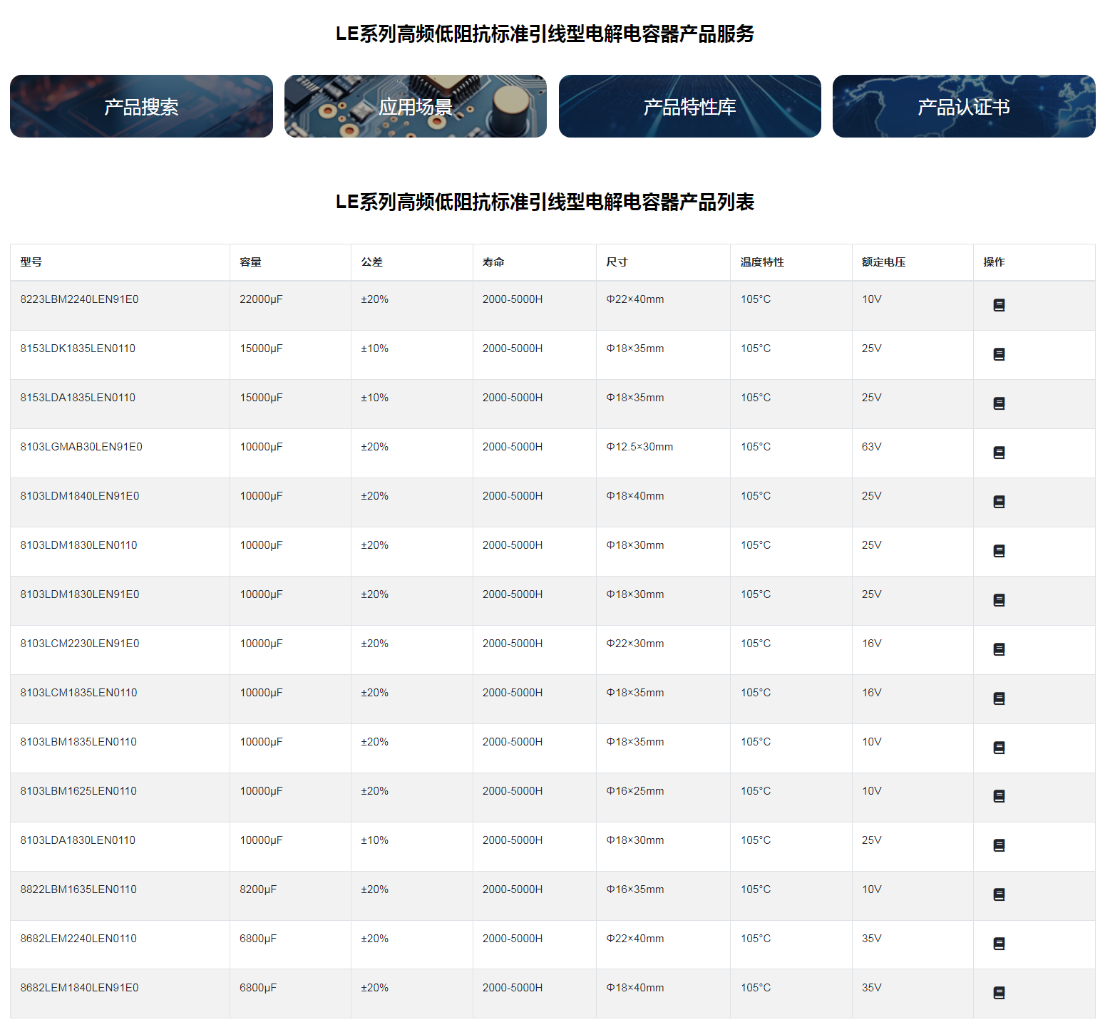 ■LE系列高频低阻抗标准引线型电解电容器◆特征* 寿命: 105℃ 2000~5000 小时* 低阻抗* 符合 RoHS◆应用:* 适用于各类照明电源、通信设备 、开关电源等电子产品