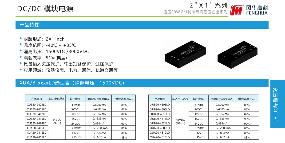 产品特性:封装形式:2X1inch温度范围:-40℃~+105℃.隔离电压:1600VDC满载效率:93%(典型)具备输入欠压保护、输出短路保护、过压保护应用领域:仪器仪表、电力、通信、轨道交通等