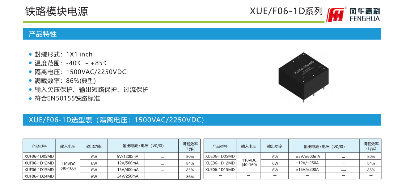 产品特性:封装形式:1X1inch温度范围:-40C~+85℃℃隔离电压:1500VAC/2250VDC满载效率:86%(典型)输入欠压保护、输出短路保护、过流保护·符合EN50155铁路标准