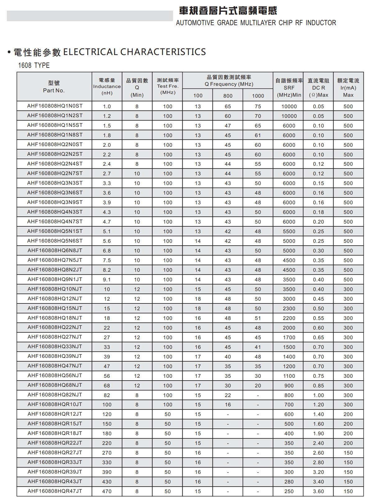 车规叠层片式高频电感器具有高自谐振频率的电感器,用于汽车多媒体何无线连接系统、车身与舒适系统。